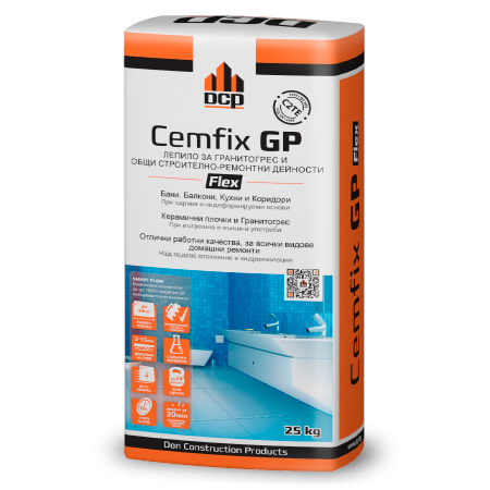 Cemfix GP е сив/бял прахообразен материал, готов за употреба след добавяне на вода и лесен за нанасяне. С устойчивостта си на плъзгане, Cemfix GP е подходящ за вертикално полагане без свличане и не е необходимо използване на кръстачки за фуги, за плочки с нормален размер. За сухи и мокри условия