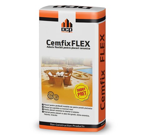 Cemfix Flex is a single component, high performance tile adhesive consisting of a blend of cement, well graded aggregate, and high content of modified polymers that forms when mixed with water an outstanding tile adhesive that is capable of fixing all types of heavy or large ceramic tiles and natural stone on all common construction substrates that may be subjected to vibration or limited deflection internally or externally.