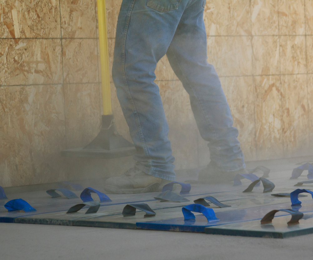 Using a reference line, begin by placing the first mats using this line and move across the slab. When stamping, the mats should be tamped using a special pounder without delay