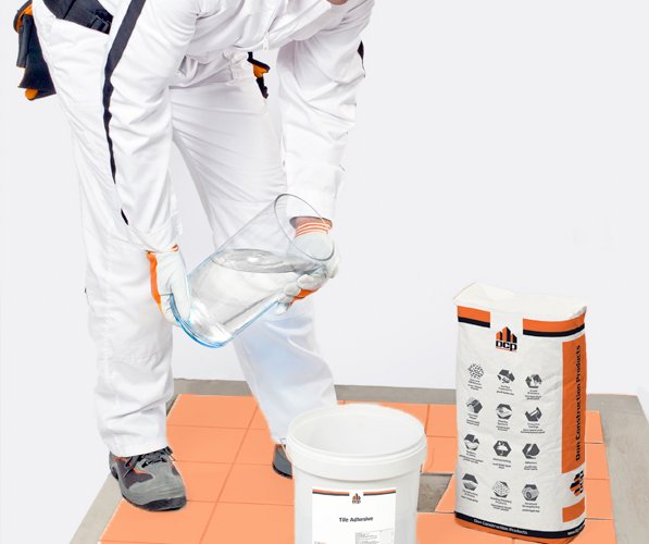 - ضع ماء الخلط في وعاء نظيف ، أضف المسحوق الجاف للاصق/الغراء ببطء إلى الماء مع الخلط المستمر باستخدام خلاط / مثقاب منخفض السرعة (400 - 600 دورة في الدقيقة).