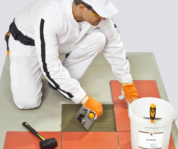 - للبلاط بقياس أكبر بعد 40 سم او اكثر : يوصى باستخدام لاصق البلاط بسمك 5 مم ، ويمكن تحقيق هذه السماكة باستخدام مالج مسنن مربع الشكل بقياس 10 مم × 10 مم.